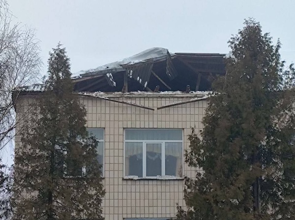 З оприлюдненого фото видно часткове обвалення покрівлі: зруйнована верхня частина даху, покриття провалене всередину. Конструкції виглядають оголеними, без суцільного покрівельного шару, а пошкодження має локальний характер, не по всій будівлі.