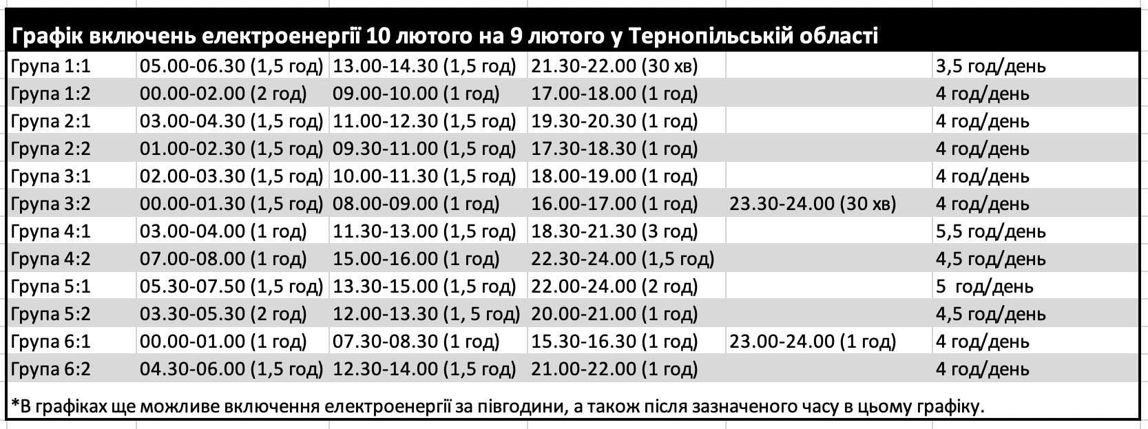 У графіку вказано час включення світла!