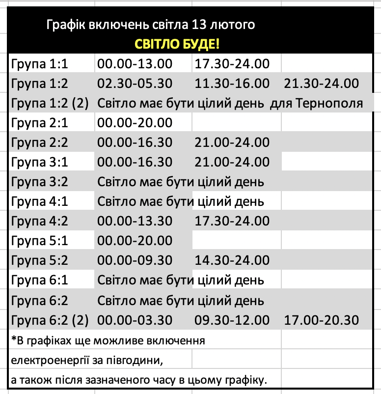 ⏰Згідно вказівки НЕК “Укренерго” 13.02.2026 на території Тернопільської області діятиме Графік погодинних відключень (ГПВ).