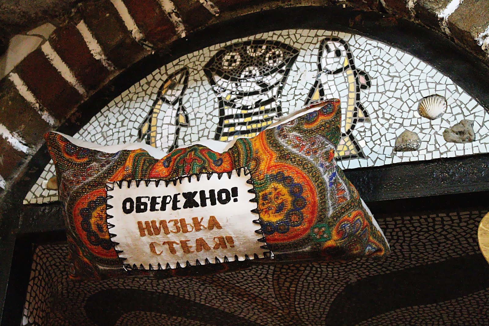 Заклад в стилі “Гауді нервово курить збоку”. Так так, саме Гауді – мозайка зі шматочків посуду та кахель, чудернацькі форми, покручені сходи, інтер’єр ніби мушля – сходи та зали ніби закручуються ведучи догори, певні архітектурні прийоми в стилі видатного архітектора. Побудоване все це чудо-диво у 2003 році. Якщо не помиляюсь, сам власник закладу пан Михайло Гросуляк проектував ресторацію та будував заклад. Шкода, що погода не дозволила зробити фото знадвору – сильний сніг і вечір взяли своє…
