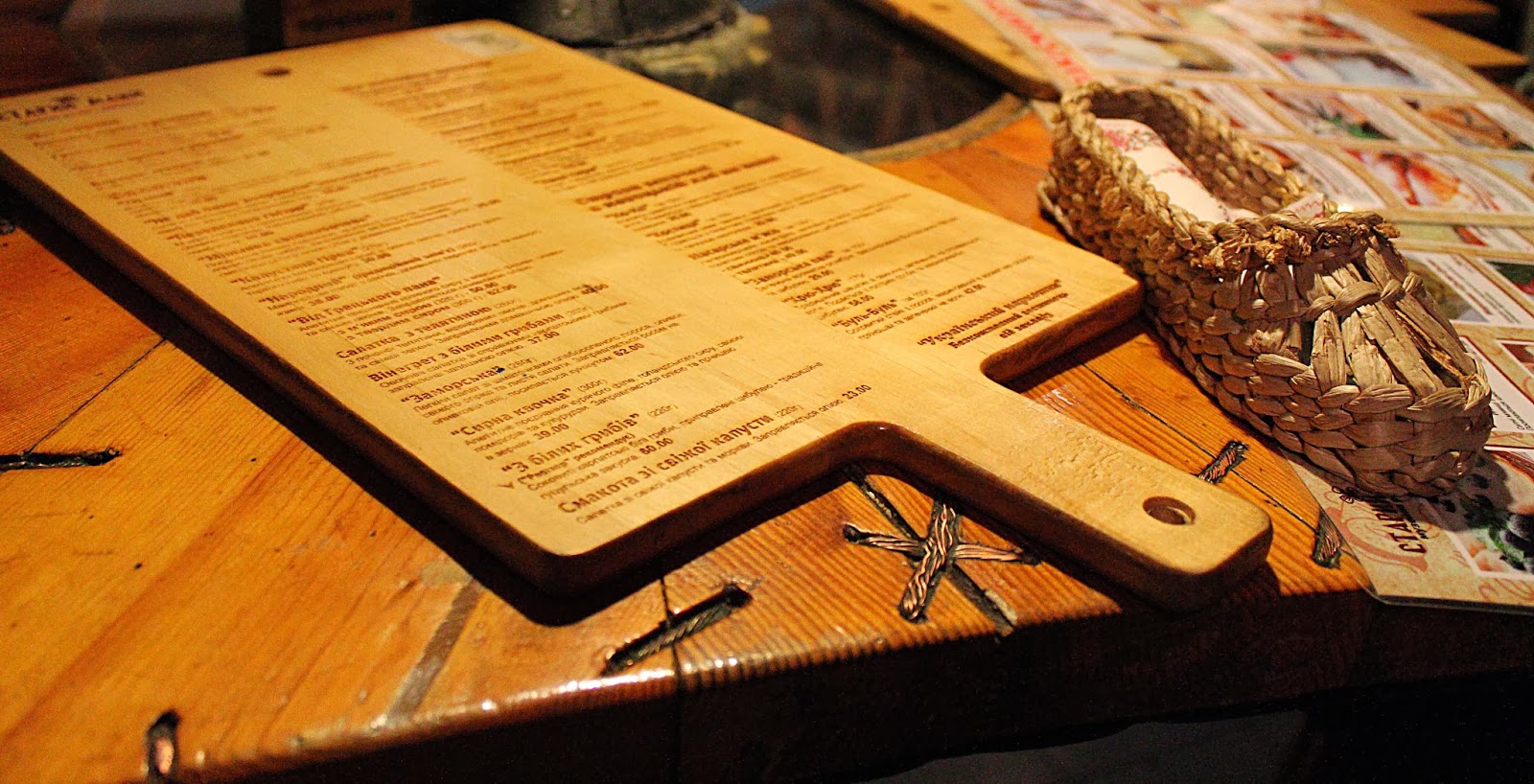 Стравопис має дещо нетрадиційний вигляд – назви страв випалені на дерев’яних дошках