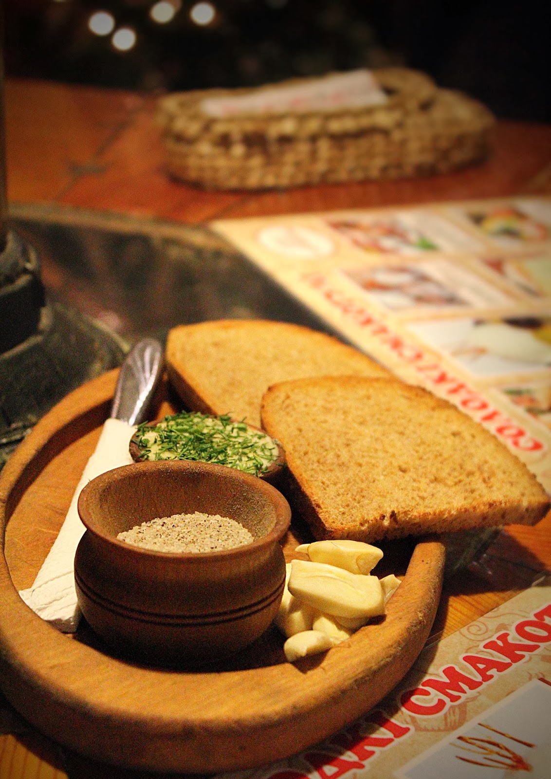 До кожного замовлення – комплімент від закладу – грінки з чорного хліба з часником та намазкою з сала. Але ми так і не попробували:) Михайло мав до борщу пампушки, а мені до вареників не надто пасувало. Та й грінки – не на мої слабкі зуби. Та все ж приємно. І колоритно.