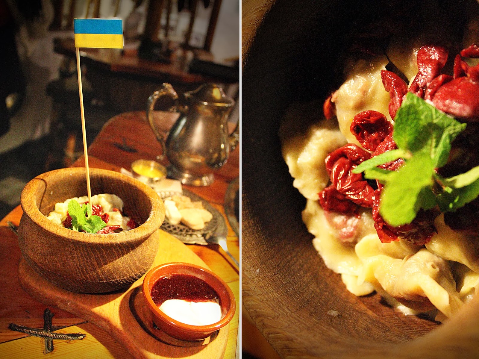 Можна їсти дерев’яною ложкою, а можна і звиклими приборами. Наступними були мої вареники – в дерев’яному полумиску-макітрі (не знаю навіть до чого то було наближене) з сметаною та варенням в додаток. Це був справжній смак літа! Порція (40 грн.) видалась мені завеликою, тому я здала позицію залишивши третину… Ніжне тісто, соковиті вишні, в міру підсолоджені – ідеальний смак. без коментарів.