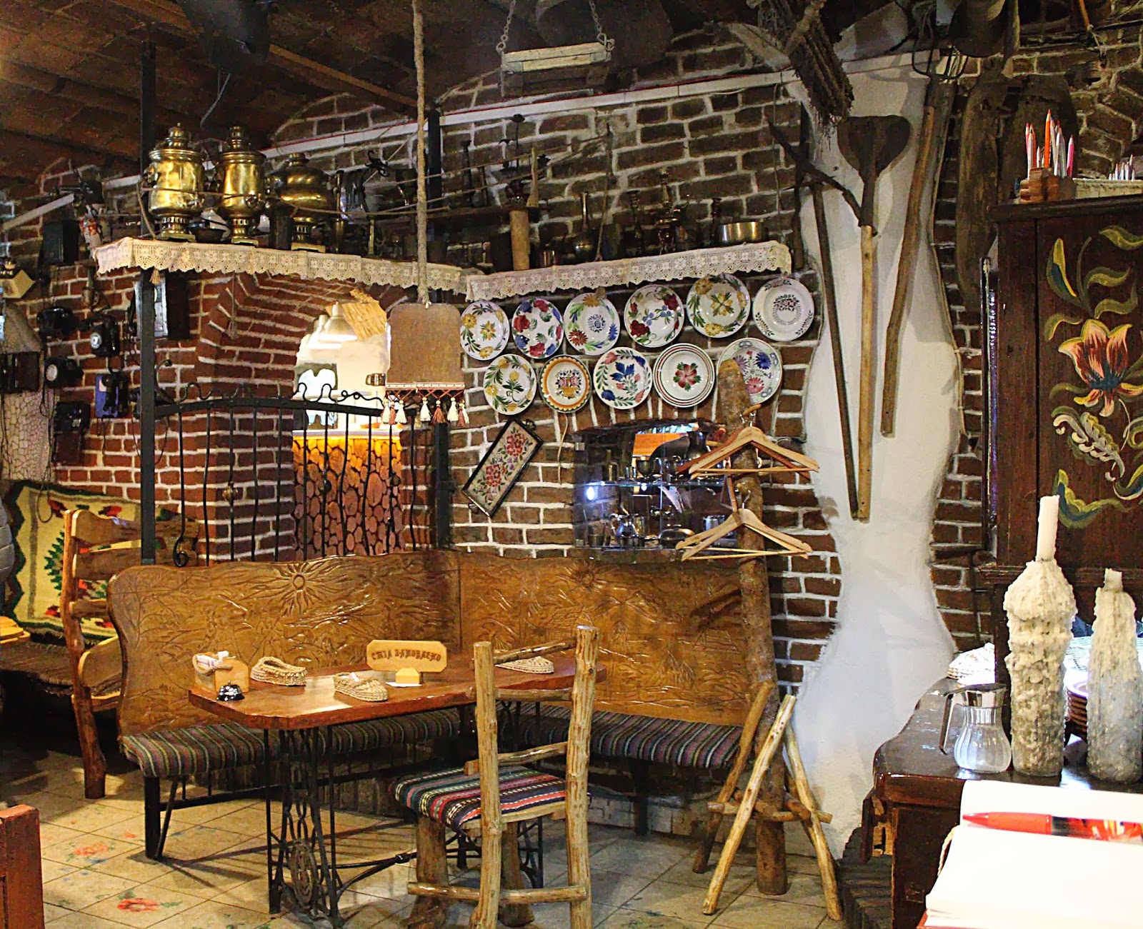 Нас обслуговував чорнобровий хлопака, який як і всі офіціанти закладу був одягнутий у полотняний одяг з елементами вишивки, на голові мав бриля, через плече – торбинку. Нагадував пастуха. Виглядало то все круто ( дівчата-офіціантки мають довгі полотняні сукні або строї і квіти у волоссі) і дуже натурально – ніби вони в своєму часу і в своєму місці, жодного театру чи награності.