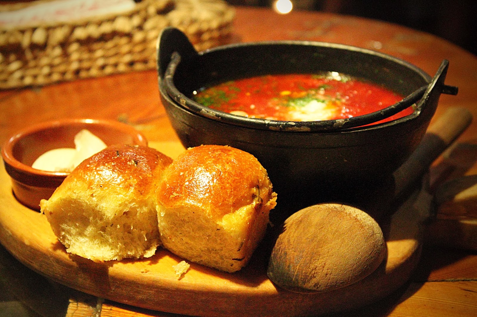 А от і борщ ( якщо не помиляюсь – 35 грн. за порцію). Михайло був задоволений – казав, що це один з кращих борщів, який йому доводилось пробувати. Оригінальна подача теж не лишає байдужими – що ж то за борщ, що без цибулі та пампушок? Цей був правильний:)