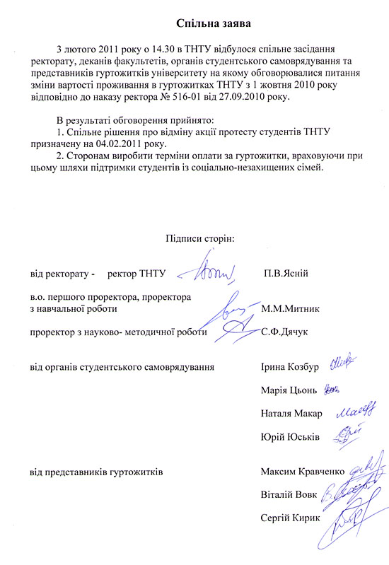 Заключивши на початку навчального року договір із керівництвом ВНЗ на конкретну суму, тепер студенти дізналися, що змушені сплатити іншу – вдвічі більшу. Студенти обурені підвищенням вартості проживання у гуртожитках, а також тим, що розпорядженням, виданим в кінці січня 2011 року, незаконно встановлено доплату не лише за наступні місяці 2011 року, а й за період з жовтня 2010 року, тобто «заднім числом».