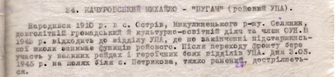 Качуровський Михайло Іванович – псевдо «Пугач», точна дата народження невідома… Народився у нашому селі. Селянин, тобто той, хто працював на землі. Довголітній громадський і культурно-освітній діяч у селі. Ймовірно, мав музичну освіту – грав на гармонії. Відомо, що з довоєнних часів став членом ОУН. У 1941 р. спільно з іншими патріотами організовував Українську міліцію у селі… Коли у Тернопільщині в 1943 р. ОУН розпочала формування бойових підрозділів Української Народної Самооборони (УНС), що згодом були перейменовані в Українську Повстанську Армію (УПА), Михайло у листопаді того ж року відійшов до створюваної Тернопільської сотні «Буйні» (за тодішнім говорінням – «Буйних»).