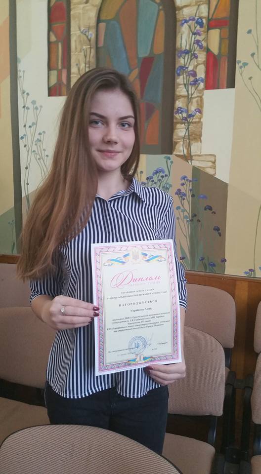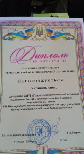 Студентка першого курсу медичного факультету Тернопільського державного медичного університету імені І.Горбачевського Анна Українець виборола І місце в другому етапі VІІ Міжнародного мовно-літературного конкурсу учнівської та студентської молоді імені Тараса Шевченка.