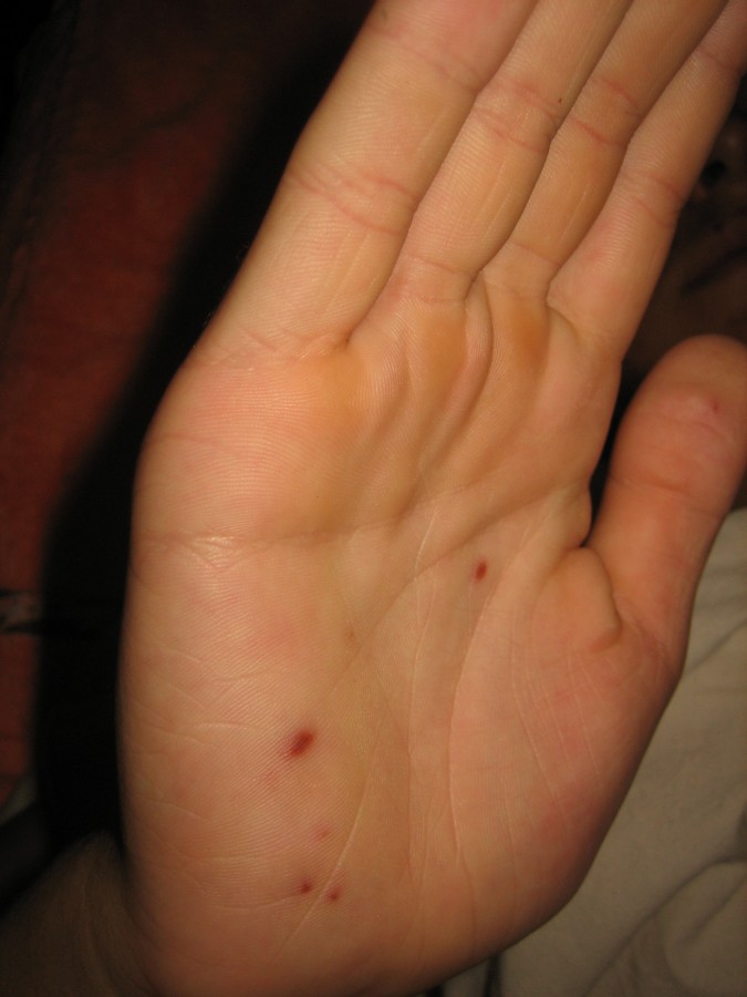 Першими симптомами є короткотривалі (3-5 днів) підвищення температури до 38,5-39,0 градусів, виразні симптоми інтоксикації, болі при ковтанні, м’язові болі, що часто розцінюється як ГРІ. Однак, на відміну від ГРІ через 1-2 дні на долонях (іноді на тильній поверхні кисті, фото 2) і стопах (частіше підошвах, фото 3), рідше на задній поверхні стегон і сідницях, обличчі (фото 4) з’являється висип у вигляді везикул (порожнинний елемент з прозорим вмістом, що підноситься над поверхнею нормальної шкіри) невеликого розміру до 3 мм в діаметрі, оточених віночком почервоніння, рідше папули такого ж розміру (безпорожнинні утвори шкіри, що підносяться над поверхнею нормальної шкіри). У динаміці відбувається зворотний розвиток висипу: елементи не розкриваються, вміст їх зникає, відбувається порівнювання їх з поверхнею нормальної шкіри, почервоніння зникає. Висип тримається у хворого протягом 5-7 днів, потім зникає безслідно. Одночасно з появою висипу на слизовій ротової порожнини з’являються виразки (афти), афтозний стоматит на внутрішній поверхні щік, язиці, яснах, твердому і м’якому піднебінні. При цьому знижується апетит, з’являється дратівливість, примхливість, можуть з’явитися болі в горлі, виникають складнощі при прийомі їжі, рясне слиновиділення.