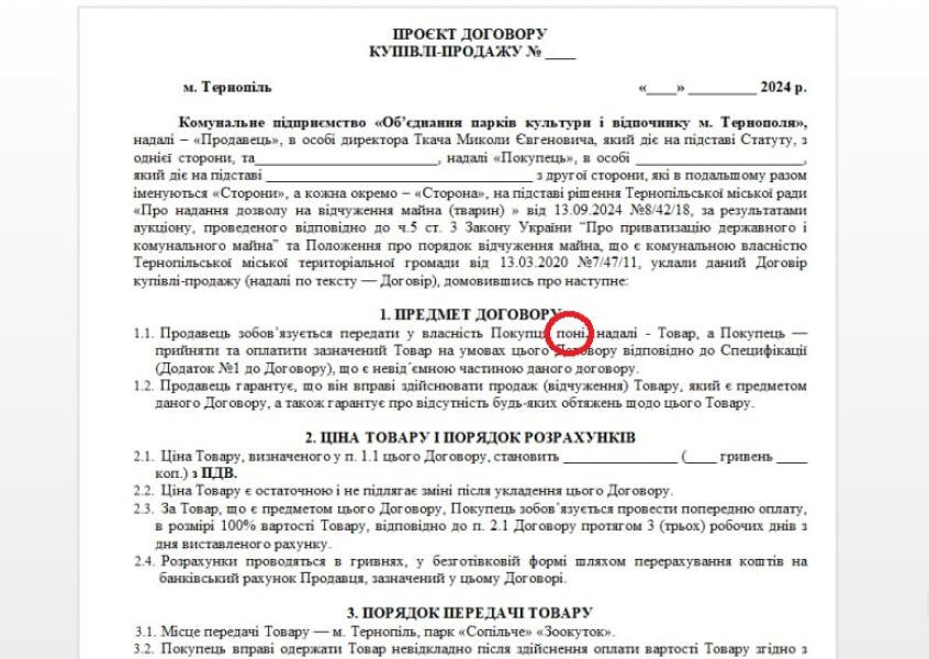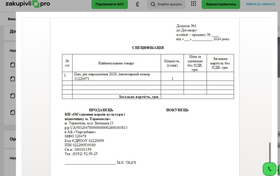 Виконавчий комітет Тернопільської міської ради від імені якого діє КП “Об’єднання парків культури і відпочинку м. Тернополя” виставив на аукціон цапа. Стартова ціна за “лот” 60 гривень. Інформація про продаж тварини з’явилася на сайті zakupivli.pro.