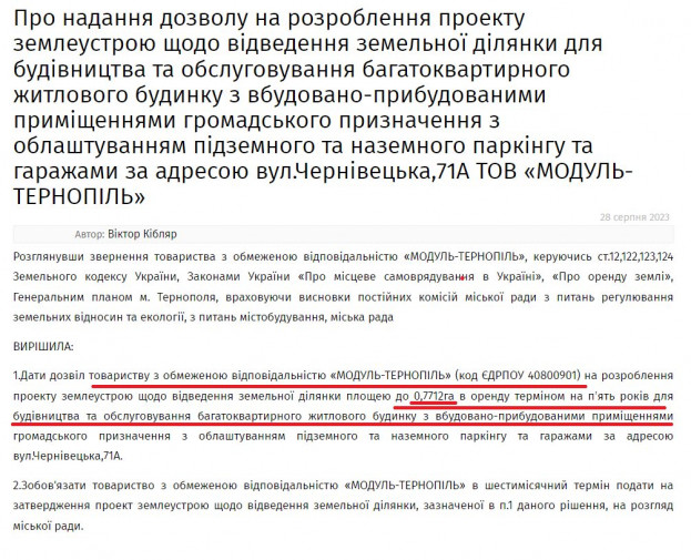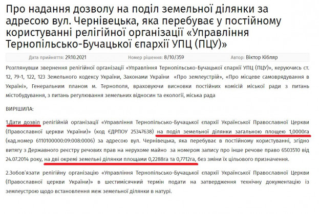 А завтра, 15 вересня, на сесію Тернопільської міської ради виноситься питання надання більшої частини поділеної ділянки (0,7712 га), на якій знаходиться каплиця церкви, ТОВ «МОДУЛЬ-ТЕРНОПІЛЬ» з цільовим призначенням “для будівництва та обслуговування багатоквартирного житлового будинку з вбудовано-прибудованими приміщеннями громадського призначення з облаштуванням підземного та наземного паркінгу та гаражами” (https://ternopilcity.gov.ua/…/proekti-rishen…/70363.html).
