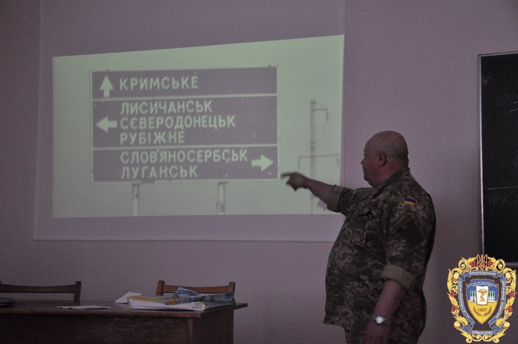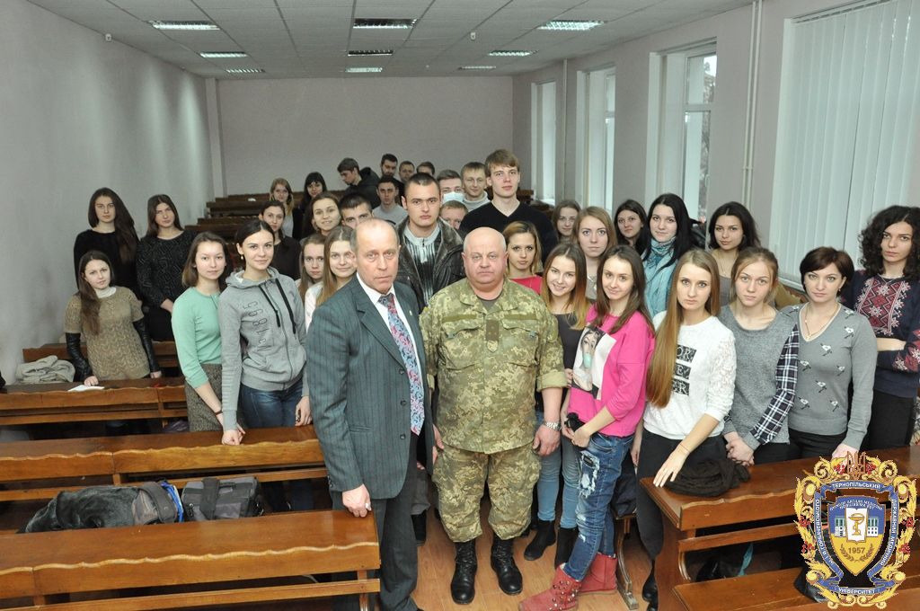 З метою патріотичного виховання студентської молоді і кращого розуміння майбутніми медиками подій, які відбуваються на Сході України, завідувач кафедри нормальної фізіології Тернопільського державного медичного університету імені І.Горбачевського, професор Степан Вадзюк організовує зустрічі-спілкування з воїнами АТО. Про це повідомляє прес-служба Тернопільського державного медичного університету імені І.Горбачевського. Цього разу в гості до студентів ТДМУ завітав Василь Гулик, який був командиром взводу на 31 блокпосту. Рік тому чоловікові разом зі своїми побратимами вдалося відбити масовану атаку російських військ. У цьому бою Василь Гулик отримав серйозне поранення і втратив двох близьких друзів.