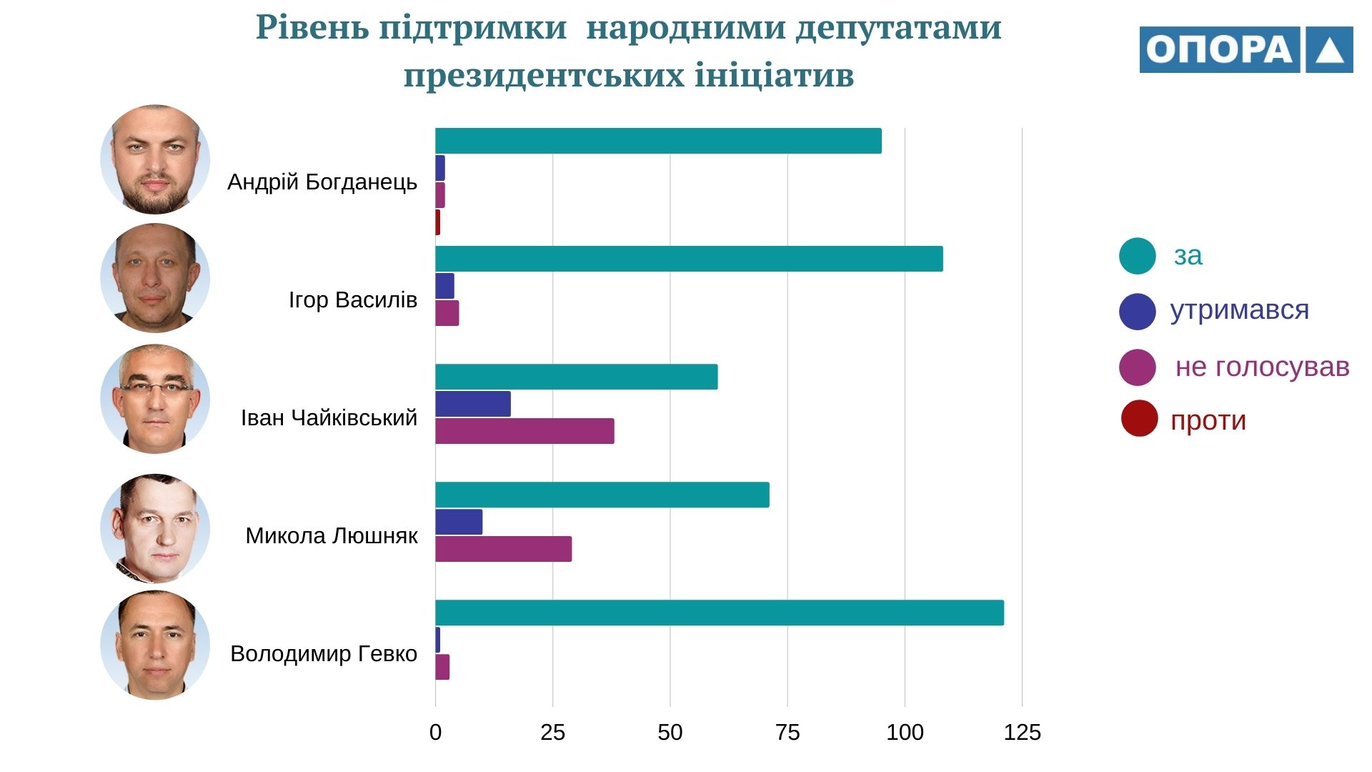 За підрахунками ОПОРИ, народні депутати, обрані у мажоритарних виборчих округах Тернопільщини, голосували за президентські проєкти у 73% випадків. Найвищий рівень підтримки (97% “За”) проявив депутат Володимир Гевко, а найнижчий (48% “За”) – Іван Чайківський. Найчастіше голосували проти ініціатив Володимира Зеленського депутати з Тернопільщини, обрані у загальнодержавному багатомандатному виборчому окрузі, які належать до фракції політичної партії “Голос”.
