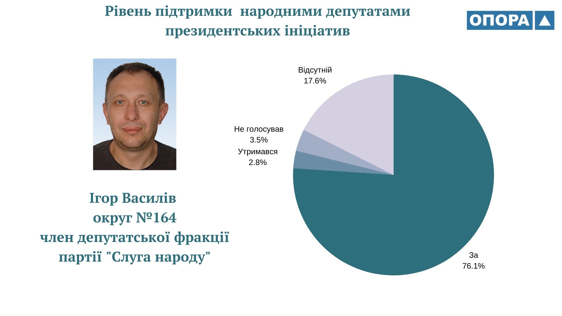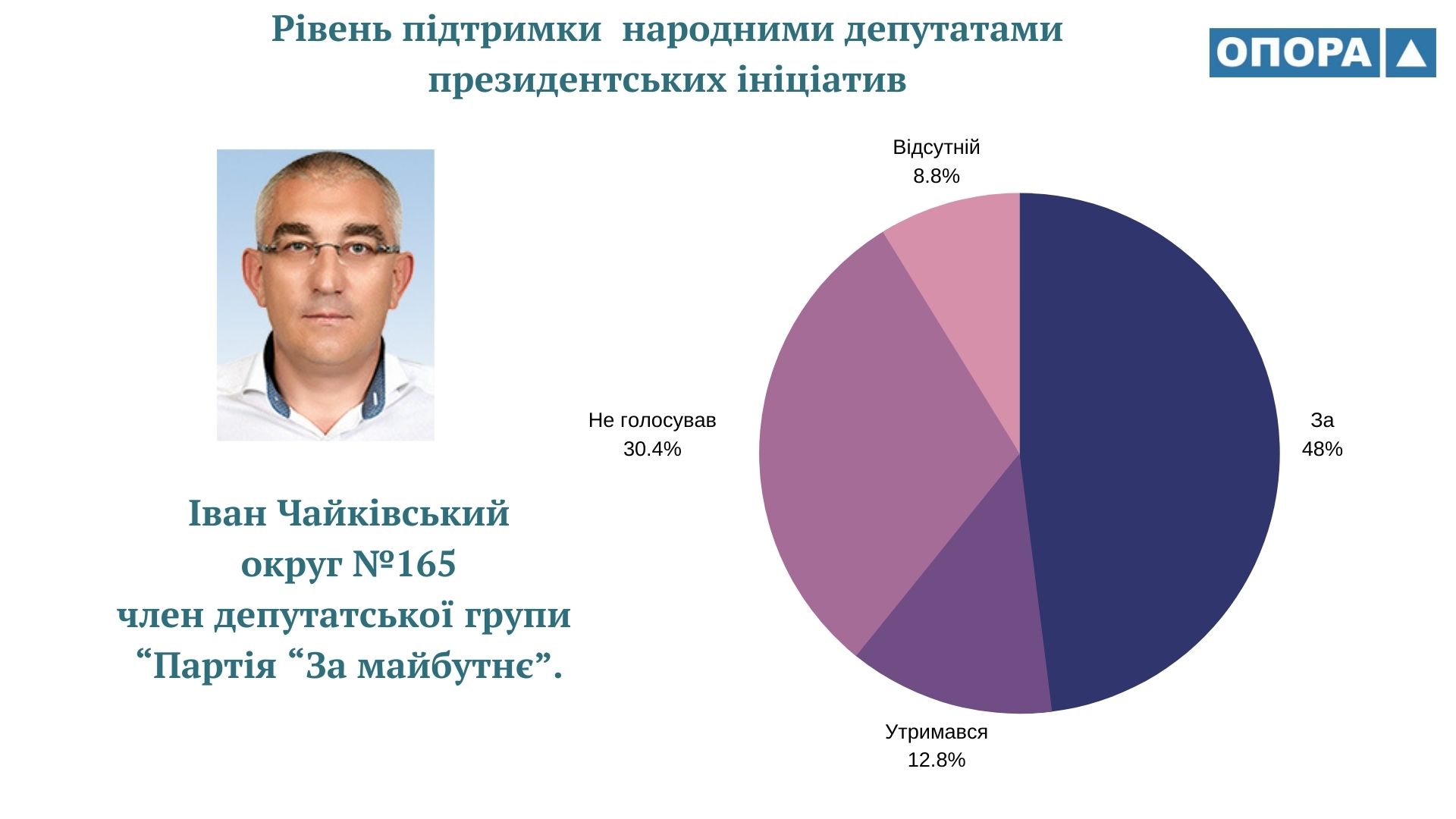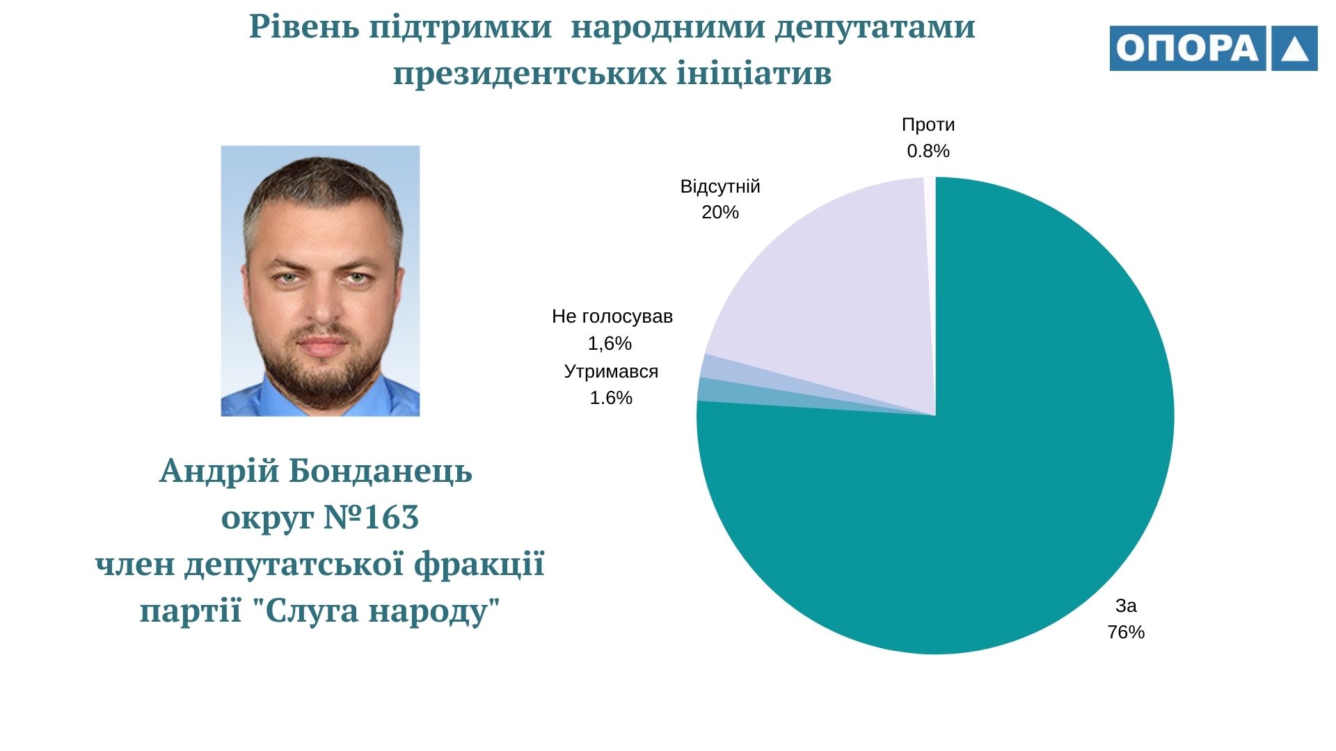 Громадянська мережа ОПОРА дослідила як народні депутати України ІХ скликання голосували за законопроєкти, що ініціював Володимир Зеленський протягом перших двох років президентської каденції. ОПОРА проаналізувала 125 відповідних рішень парламенту. А також порівняла результати із даними щодо голосувань народних депутатів VІІІ скликання за проєкти, які були внесені на розгляд парламенту Петром Порошенком. Таким чином встановила, що рівень підтримки президентських ініціатив депутатами-мажоритарниками з Тернопільщини ІХ та VIII скликань відрізняється на 2%, становить 73 та 75% відповідно.