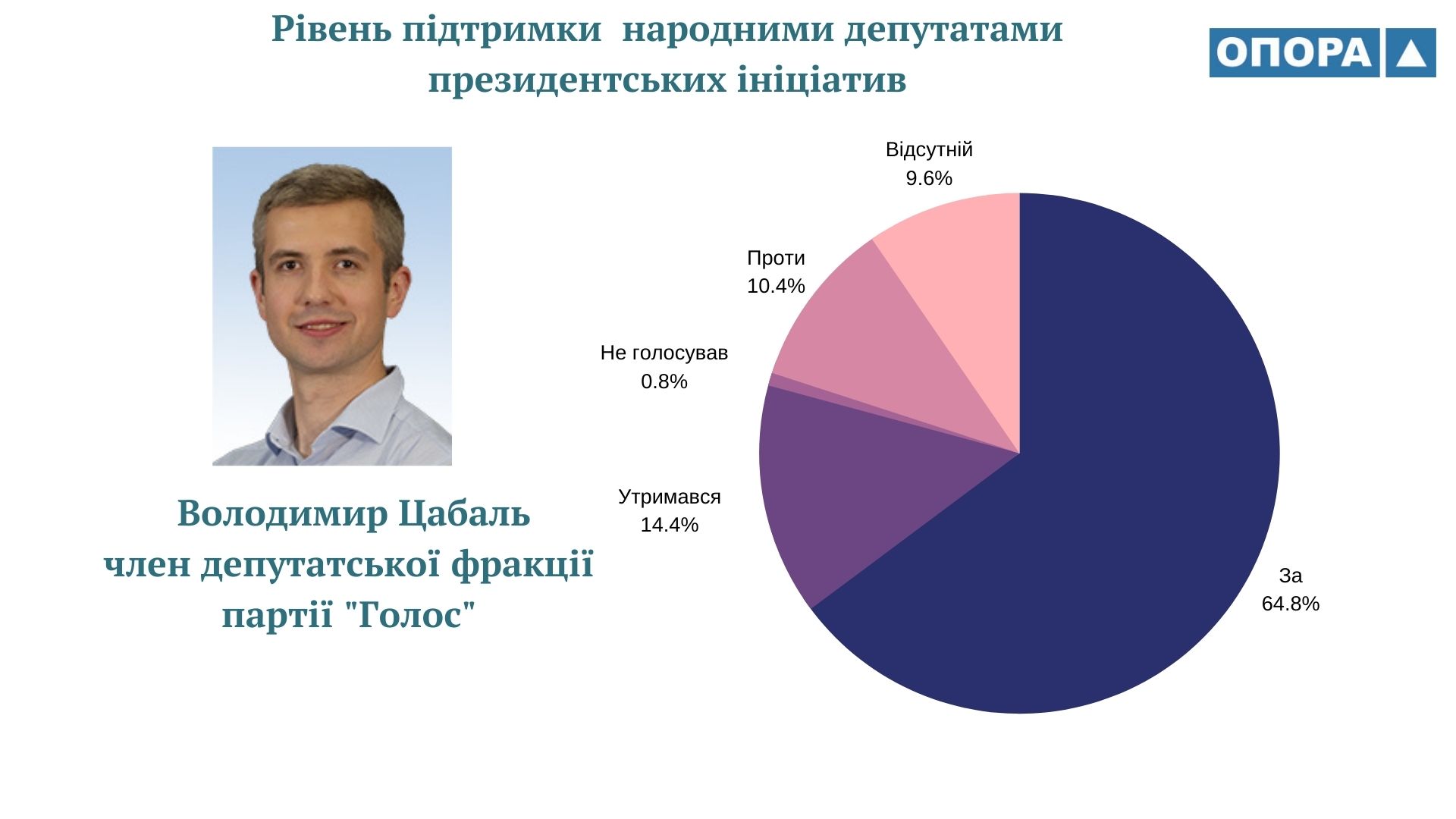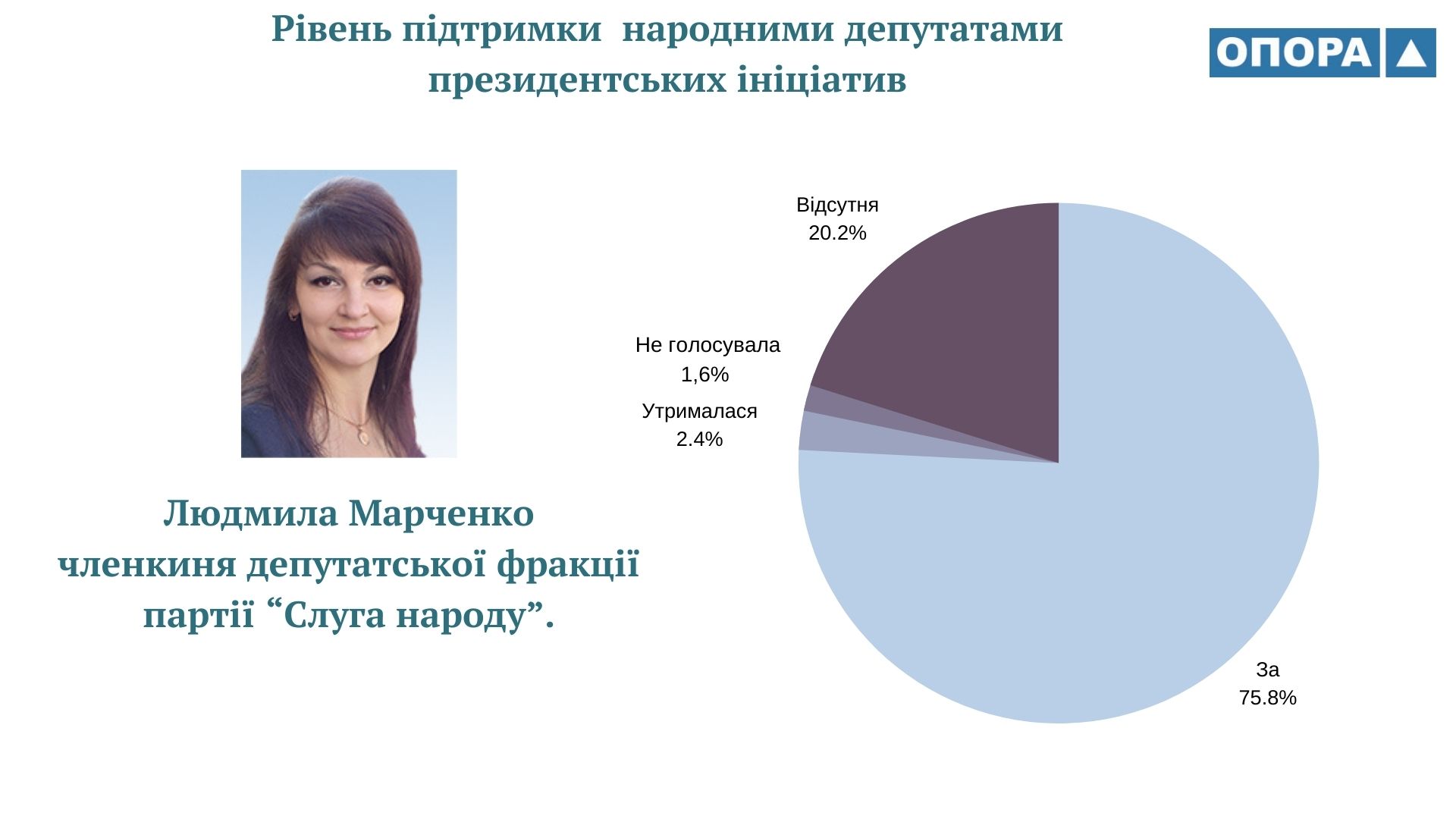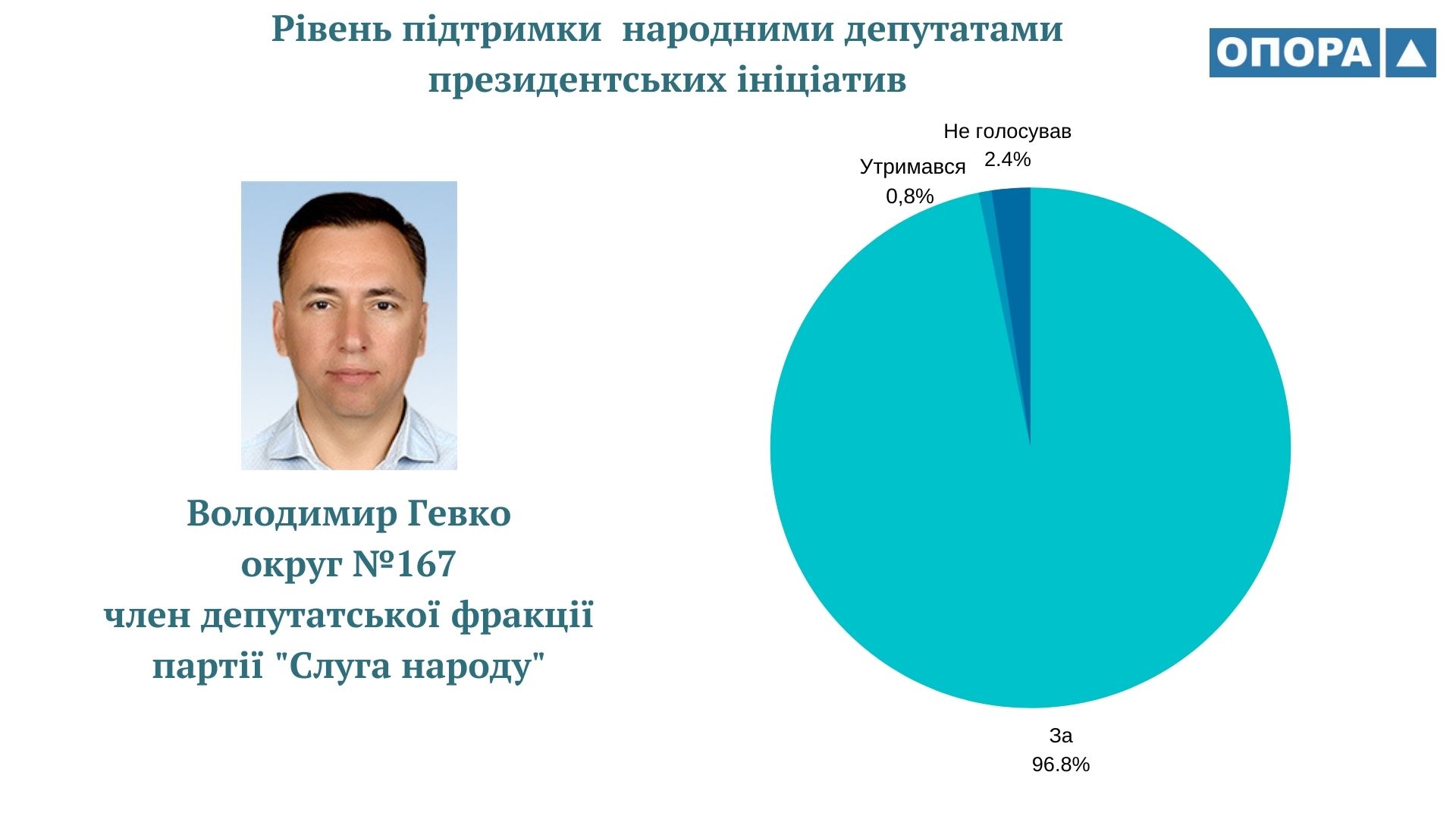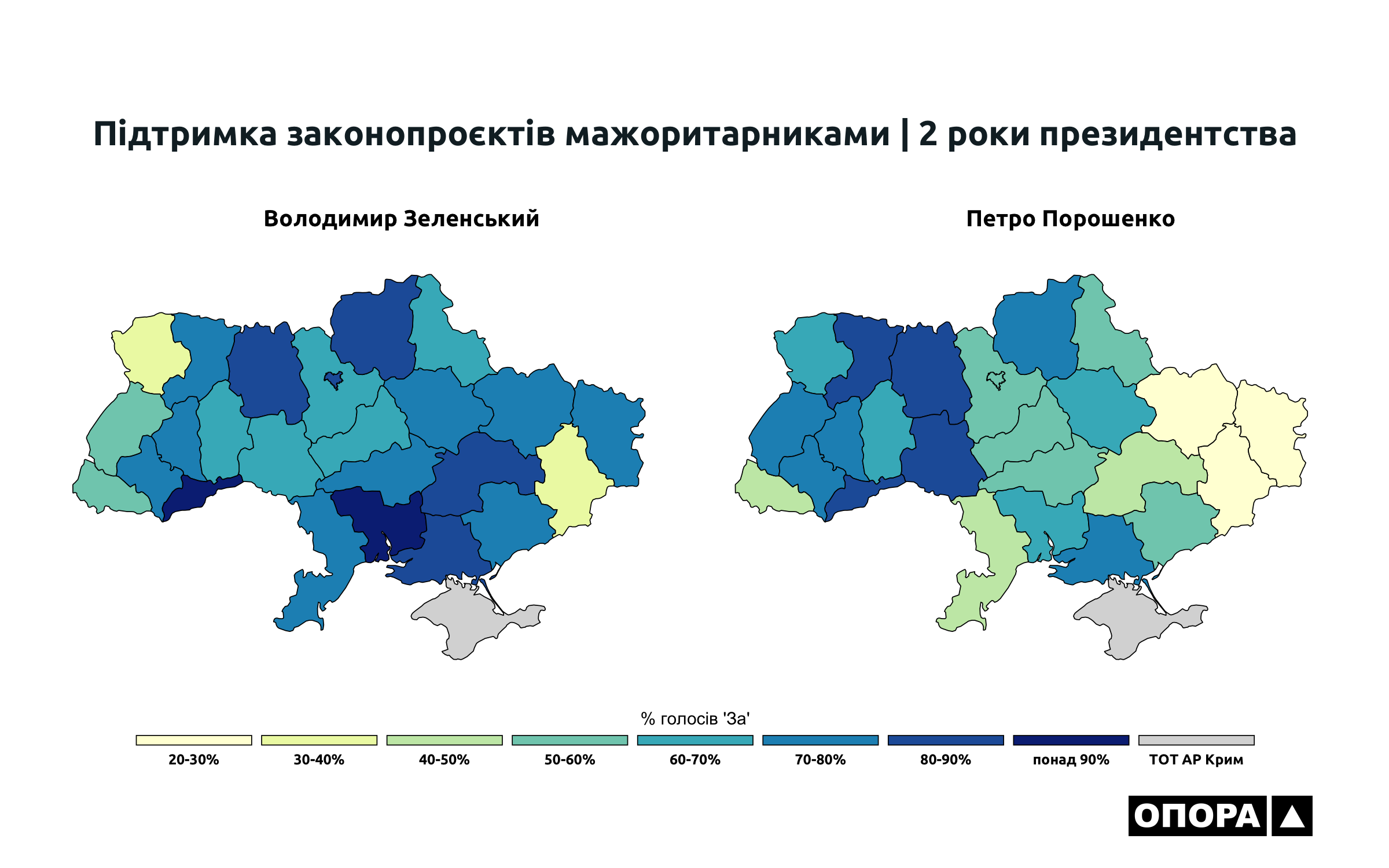 Громадянська мережа ОПОРА дослідила як народні депутати України ІХ скликання голосували за законопроєкти, що ініціював Володимир Зеленський протягом перших двох років президентської каденції. ОПОРА проаналізувала 125 відповідних рішень парламенту. А також порівняла результати із даними щодо голосувань народних депутатів VІІІ скликання за проєкти, які були внесені на розгляд парламенту Петром Порошенком. Таким чином встановила, що рівень підтримки президентських ініціатив депутатами-мажоритарниками з Тернопільщини ІХ та VIII скликань відрізняється на 2%, становить 73 та 75% відповідно.
