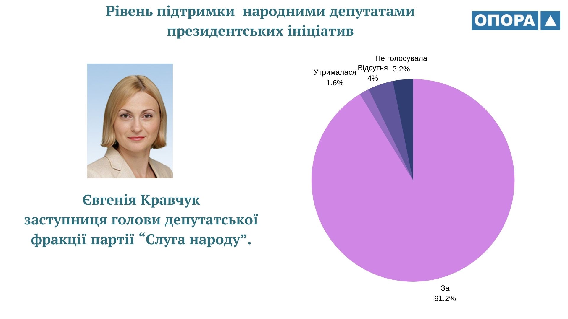 Євгенія Кравчук є заступницею голови депутатської фракції політичної партії “Слуга народу”. Вона голосувала “За” в 114 випадках (91%) за законопроєкти ініційовані Володимиром Зеленським, ще п’ять разів була відсутня, два рази утрималася і чотири рази не голосувала.
