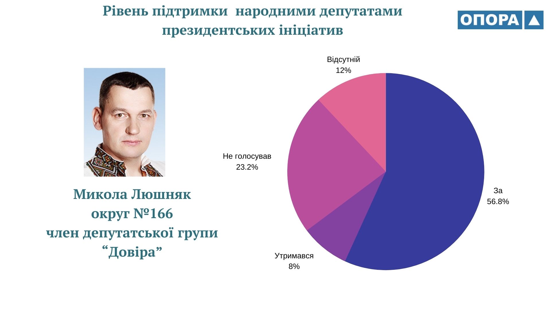 ОПОРА також проаналізувала роботу Миколи Люшняка у Верховній Раді VIII скликання та його голосування за законопроєкти Петра Порошенка. Тоді депутат частіше підтримував президентські ініціативи, голосував “За” у 83% випадків.