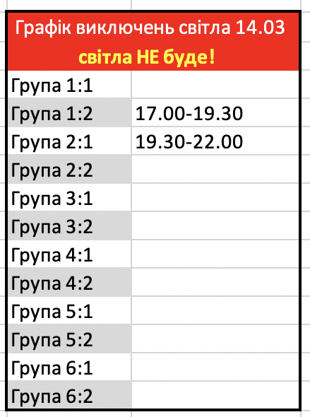 Графік відключень світла 14 березня на Тернопільщині