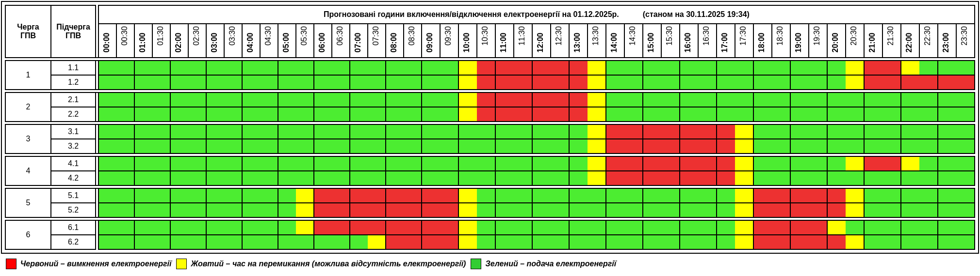 Згідно вказівки НЕК “Укренерго” 01.12.2025 на території Тернопільської області діятиме Графік погодинних відключень (ГПВ).