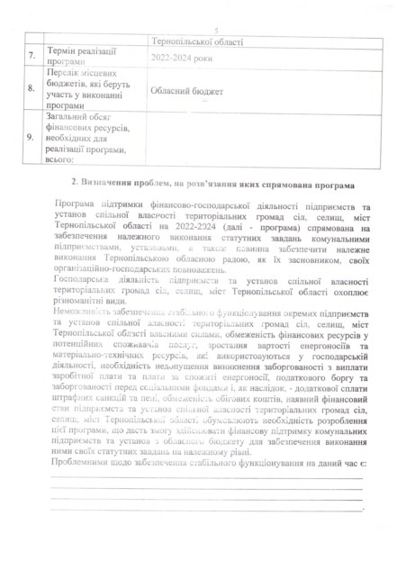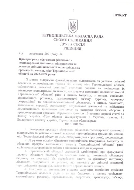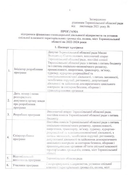 Мова йде про проєкт рішення №345 «Про програму підтримки фінансово-господарської діяльності підприємств та установ спільної власності територіальних громад сіл, селищ, міст Тернопільської області на 2022-2024 роки». Відкривши цей проєкт, не знаходиш там жодних цифр, хоча відповідні графи передбачені. При чому на проєкті стоїть підпис голови Тернопільської обласної ради Михайла Головка. Хто ж так підставив голову? У цього чоловіка є конкретне прізвище, це депутат-«свободівець» Володимир Мисик, котрий готував цей проєкт рішення. Очевидно, пан Михайло не погладить по голівці свого підлеглого за цей прокол.