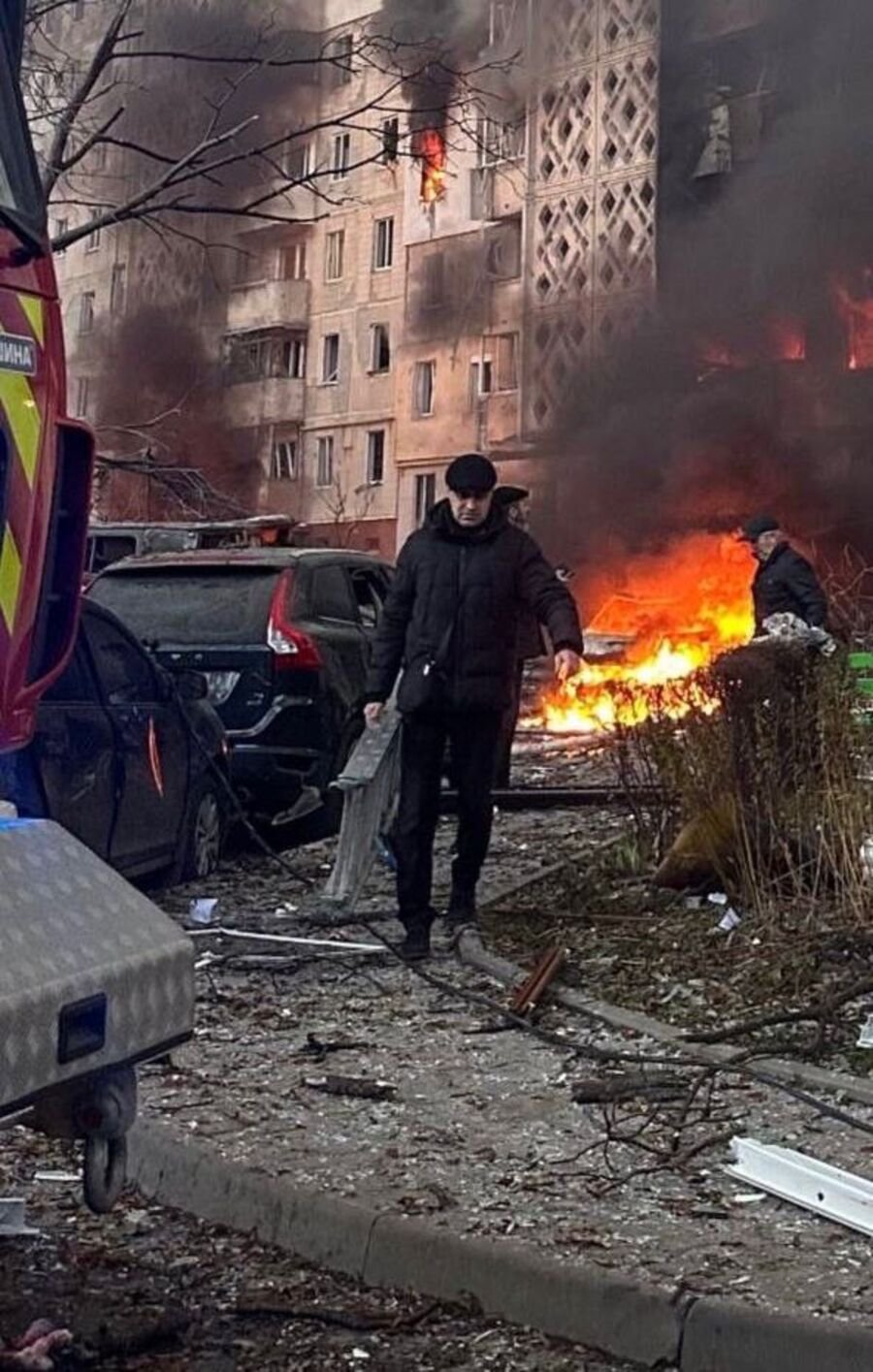 “Я навіть не знав, що спереду будинку був прильот і там ще страшніше. Машини всі горять, вибухають, там страшенний вогонь. Ми понесли драбину туди. На третьому поверсі була жінка чи дівчина, приклали драбину, але вогонь горів весь час. Я почав кричати, щоб газ перекрили, бо пожежників ще не було, тривала тривога.