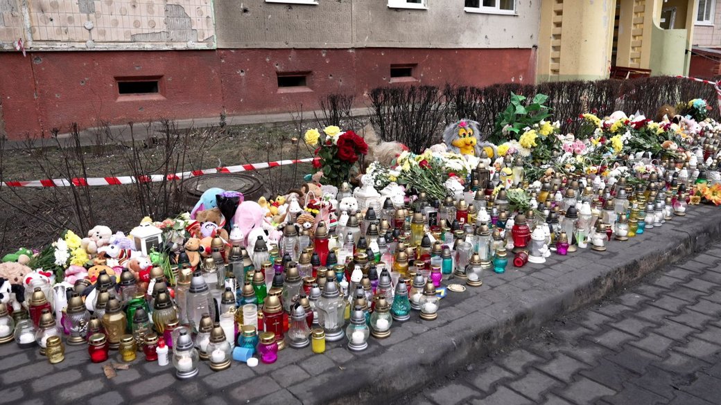 У пам’ять про загиблих від атаки 15 квітня люди несуть квіти, лампадки, іграшки. Суспільне Тернопіль