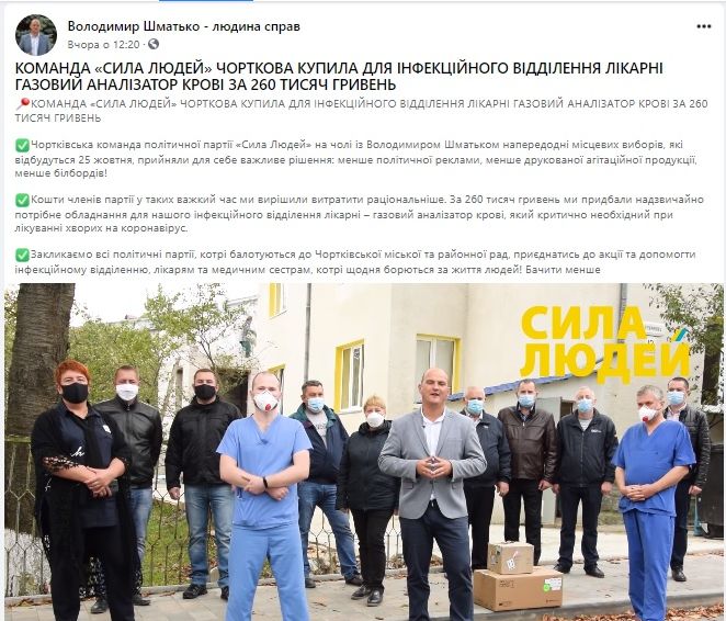 Поза тим 13 жовтня на Facebook-сторінці «Володимир Шматько – людина справ» опубліковано допис із заголовком «Команда «Сила людей» Чорткова купила для інфекційного відділення лікарні газовий аналізатор крові за 260 тисяч гривень». У ньому йшлося, що Чортківська команда політичної партії «Сила Людей» та кандидат на посаду міського голови Володимир Шматько прийняли рішення зменшити кількість друкованої агітаційної продукції і за кошти членів партії придбали обладнання для інфекційного відділення.