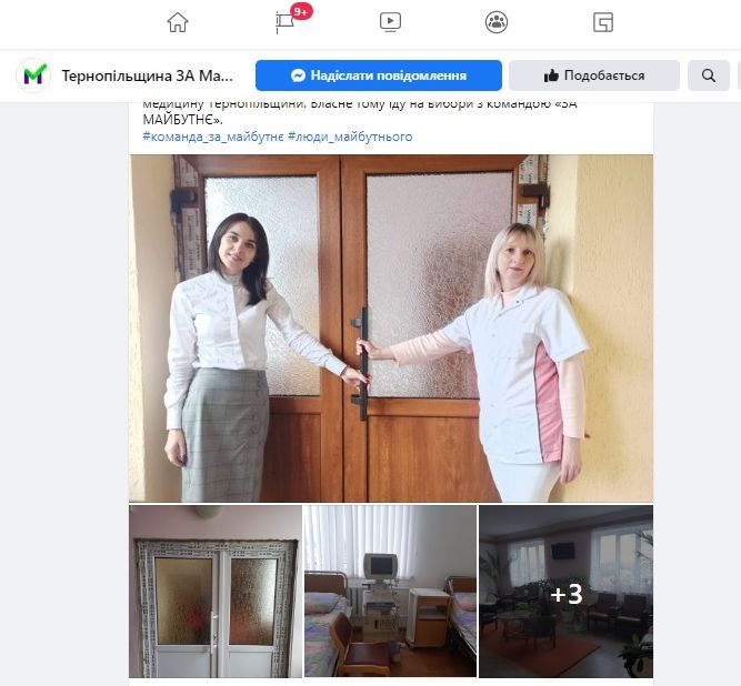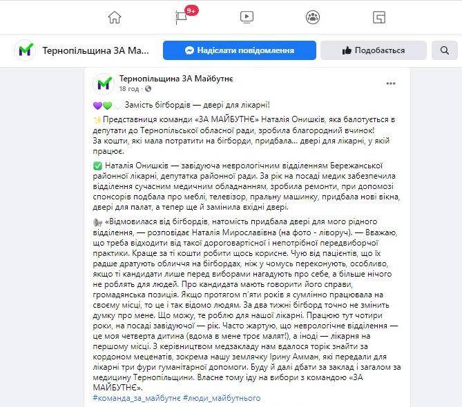 13 жовтня на Facebook-сторінці «Тернопільщина ЗА Майбутнє» опубліковано допис із заголовком «Замість бігбордів – двері для лікарні!». У ньому йшлося, що кандидатка у депутати до Тернопільської обласної та Бережанської міської рад від партії «За майбутнє» Наталія Онишків придбала двері для Бережанської районної лікарні, у якій працює.