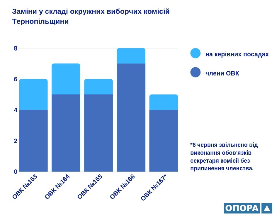У семи випадках заміни стосувалися членів комісій, які займають керівні посади. Два рази змінювали заступника голови ОВК №163. В ОВК № 167 було звільнено від виконання обов’язків секретаря комісії без припинення її членства. Таким чином від моменту утворення, станом на 8 липня, близько 46,7% керівного складу ОВК Тернопільщини є оновленим.