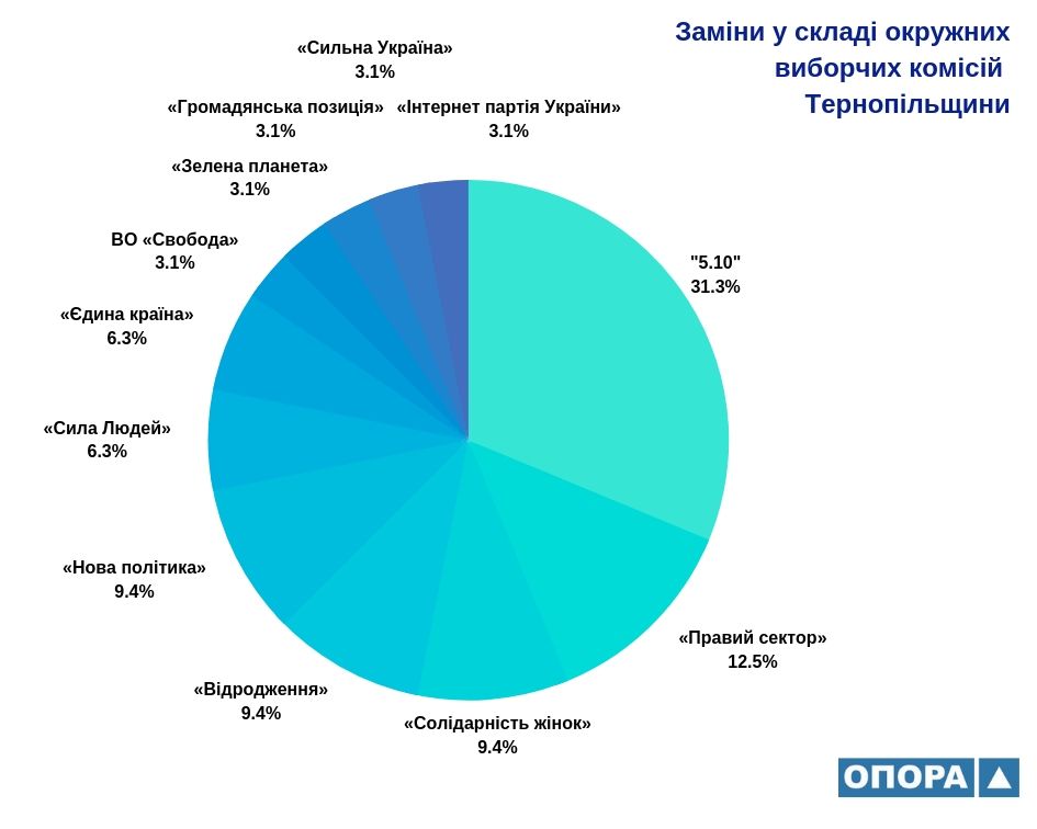 Найчастіше ЦВК приймала рішення про заміни в ОВК Тернопільщини у зв’язку із поданнями політичної партії «5.10». Таких замін було здійснено 10 по дві в кожній ОВК області. 4 рази заміни відбувалися через подання партії «Правий сектор», 3 рази – «Солідарність жінок», 3 рази – «Відродження», 3 рази – «Нова політика», з них два рази в ОВК №164. По дві заміни в ОВК стосувалися представників партій «Сила Людей» і «Єдина країна», а також по одній заміні мають партії ВО «Свобода», «Громадянська позиція», Українська партія «Зелена планета», «Сильна Україна» та «Інтернет партія України».